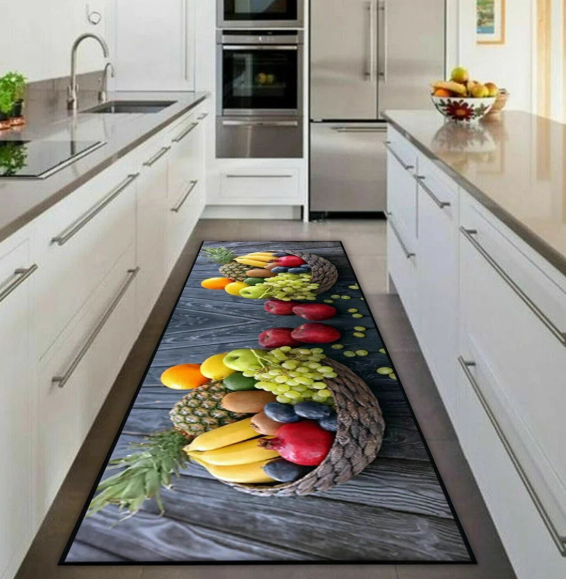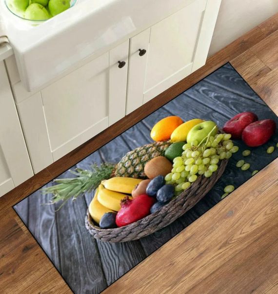 The Washable 3D Fruit Kitchen Mat features a non-slip rubber backing that keeps it securely in place on wood, tile, or marble floors—making it an ideal choice for families with kids and pets. Whether used as a kitchen runner rug, hallway mat, balcony mat, or living room rug, this versatile piece brings both safety and style.